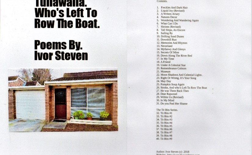 Hello dear readers, friends, family and followers. Sorry I’ve not been around to all my fellow bloggers on WP, with my usual diligence and zest. I’ve been very busy preparing my new booklet of poems. I’ve just finished the manuscript (Phew and yeah !!), and this one is called, “Tullawalla: Who’s Left To Row The Boat”, and of course along with the other 3 booklets, all money’s that I make from the sale of these booklets goes to the Geelong MS Charity Shop. The list of my 4 booklets below. These booklets are all printed here in my little writing studio/haven, put together by hand, and they’re a foolscape size folder of 21 pages and 40 poems in each booklet