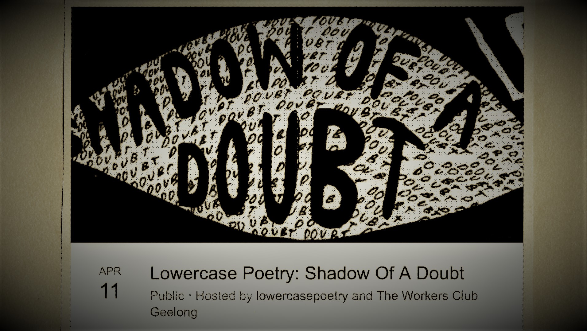Last evening I attended a poetry open mic’ event, held by ‘lowercase poetry’. The word theme for night was “A Shadow Of Doubt”. I was invited on stage to read my poem called ‘Finality”, a copy of which I’ve attached here below my Haiku, ‘Recital Haiku: Recital The voiceless man spoke An old poet … Continue reading Recital