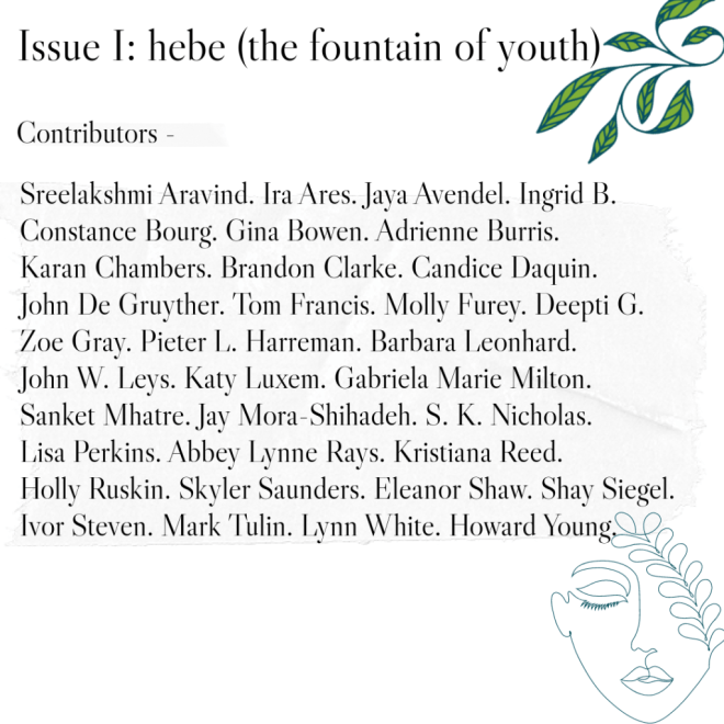 We hope you are as excited as we are about the release of Issue I: hebe (the fountain of youth)! To tease you a little further, below are the incredible writers, artists and photographers whose work will be featured in our first issue.