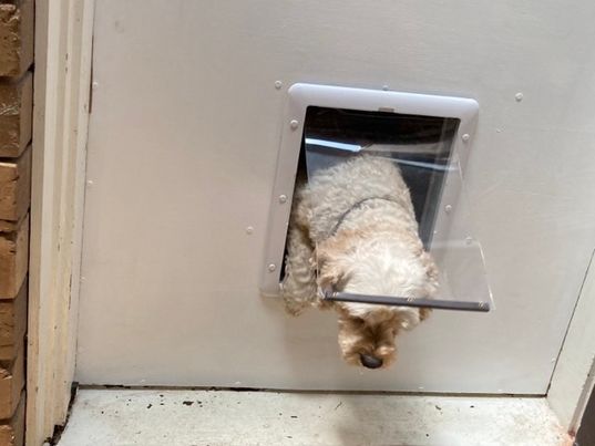 Woof woof 🐶Frankie loves his new doggie door 🐶