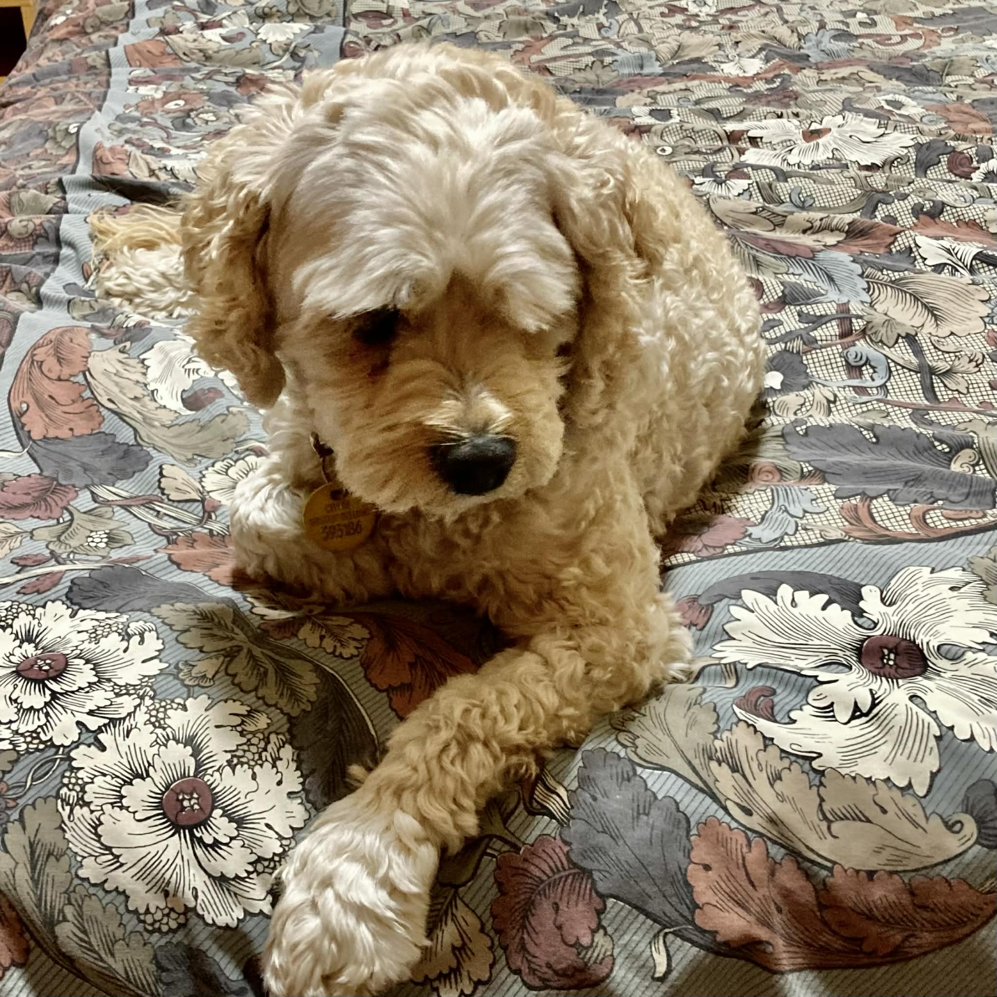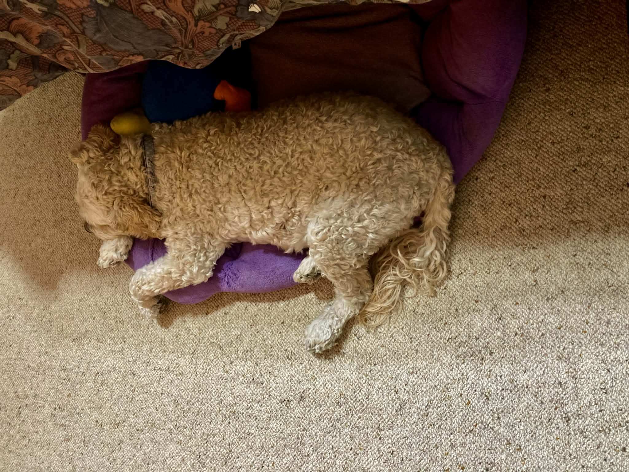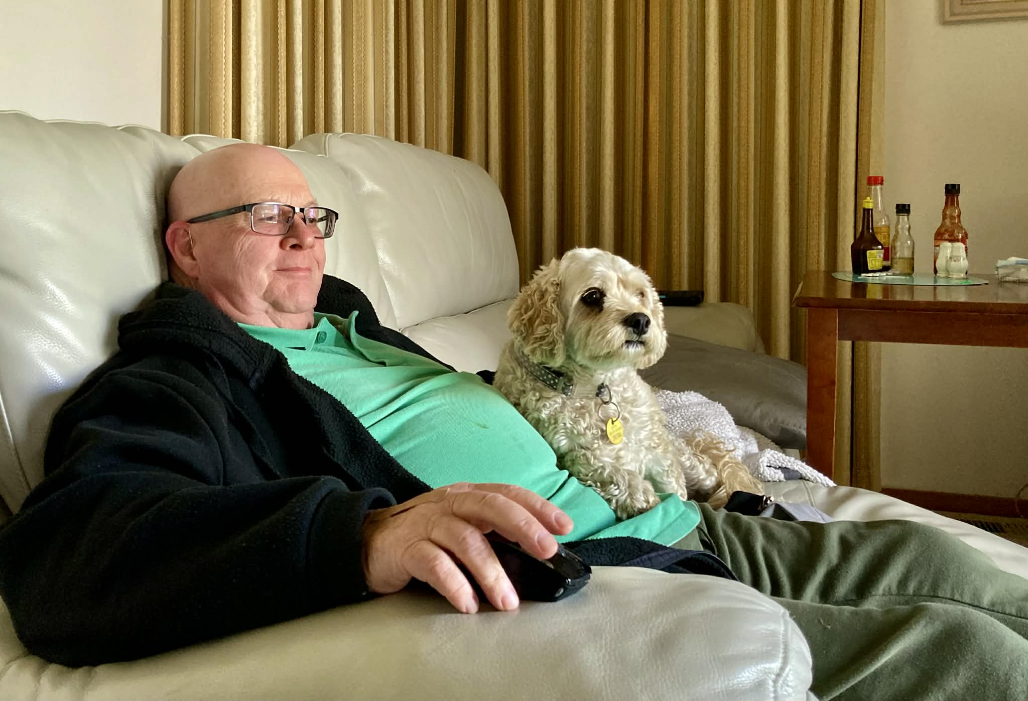 Frankie quickly makes himself at home in the bedroom and on the lounge with my brother, Lawrie
