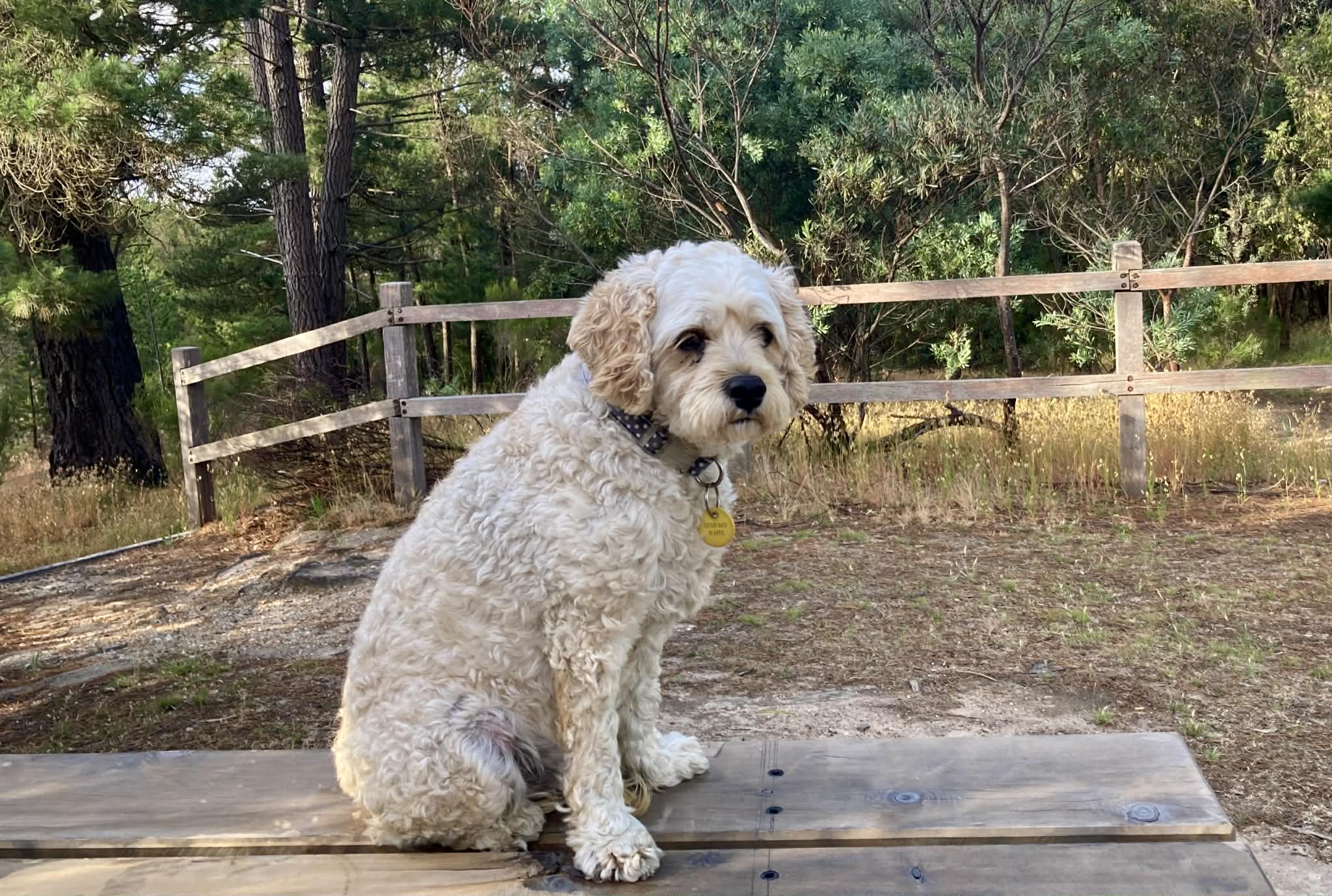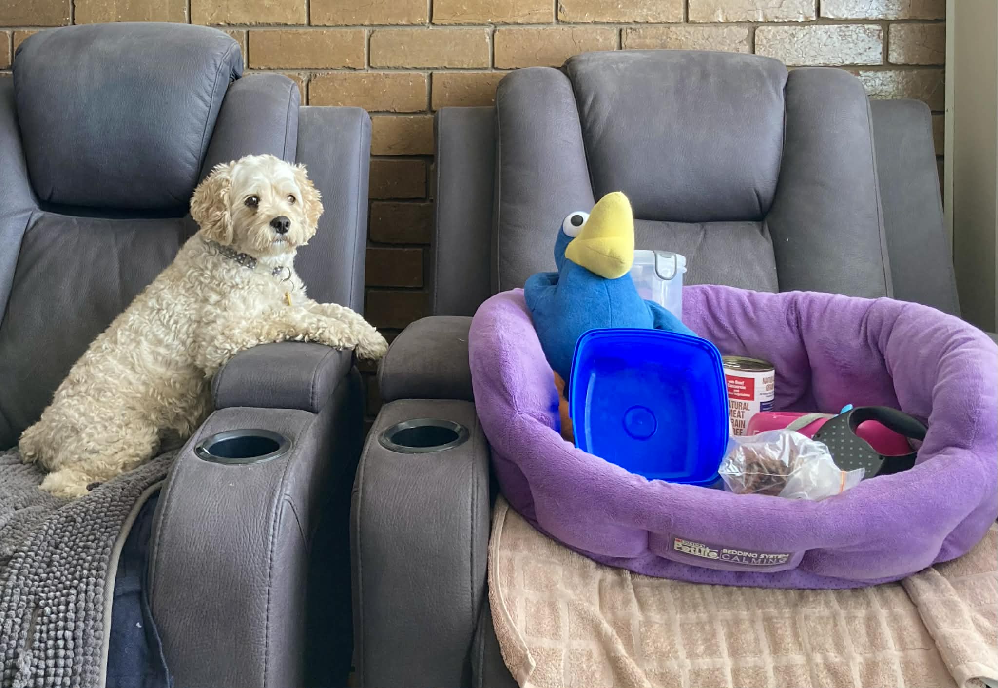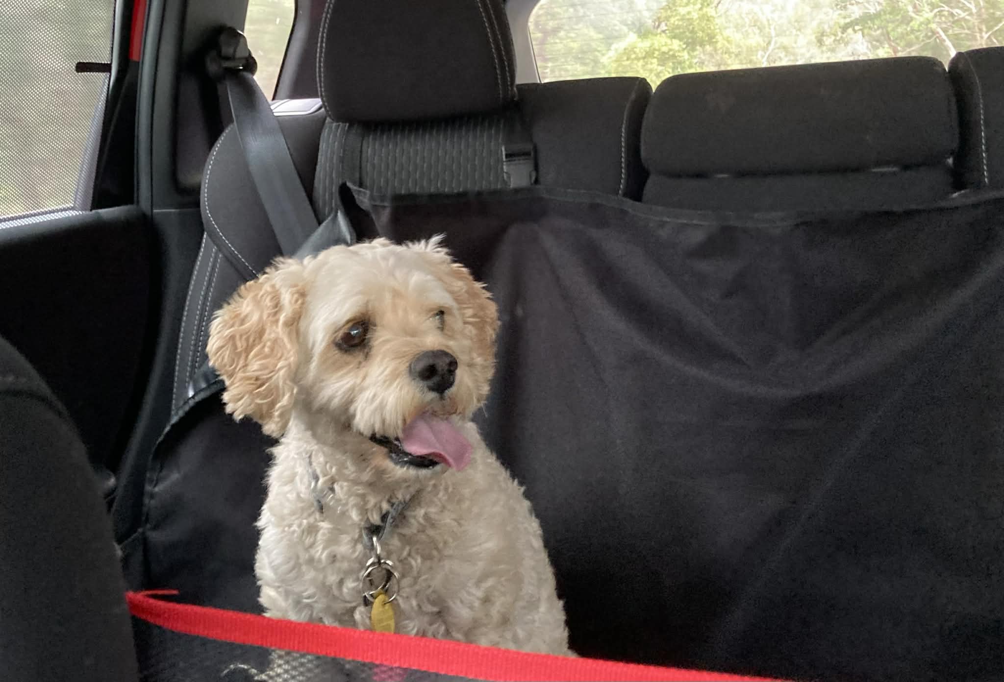 Frankie is packed and ready to go … Frankie is in the back seat on the way to Ballarat