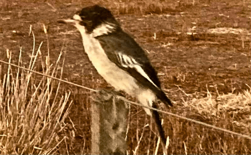 At twilight this evening, a lone peewee settled on the fence line, unexpected company above a paddock split open by summer. The moment felt like a small report from the dry season — so I let the bird speak for itself.