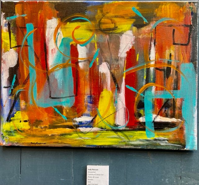 L – Terri Pollock: the challenging “Determination”, acrylic on canvas R – Nic Everist: The compelling “See Beyond What is Right in Front of Us”, acrylic on canvas.