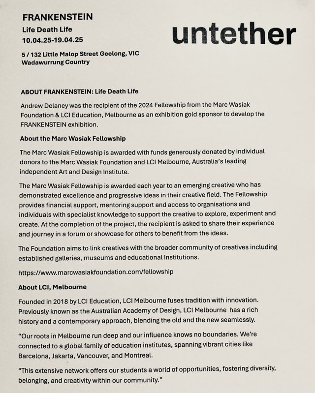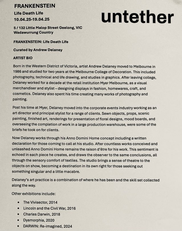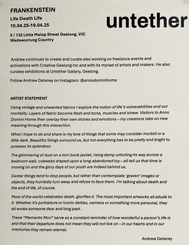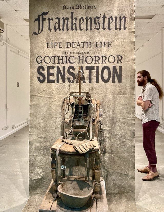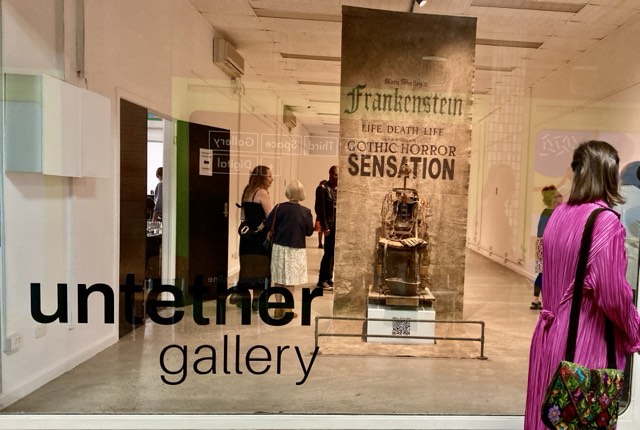 Yesterday evening I attended the opening of a unique Costume Exhibition, curated by Andrew Delaney, at the ‘Untether Gallery’ in Geelong. The transcripts about the show are attached below to help you understand what the “Frankenstein, Life, Death, Life” exhibition was about. In 1825 a play based on Mary Shelley’s infamous novel Frankenstein was staged in the Theatre Royale in Drury Lane. It was banned after only three performances and the costumes stored away …