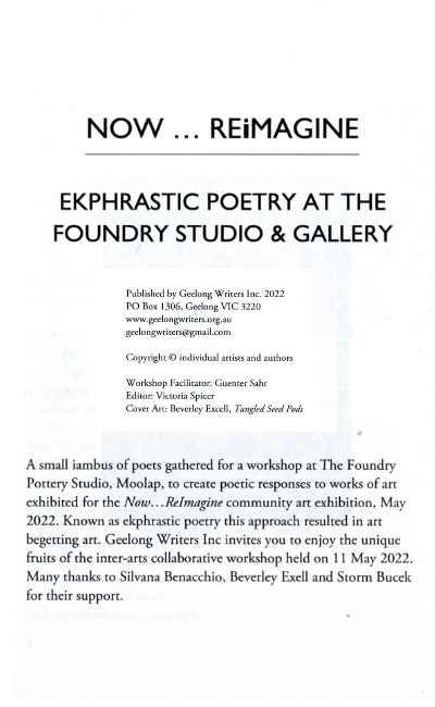 The Geelong Writers Inc produced this excellent Chapbook from the Ekphrastic workshop that I attended only Three weeks ago, and a big thank you goes to our President, Guenter Sahr, and our hard working Editor, Victoria Spicer …