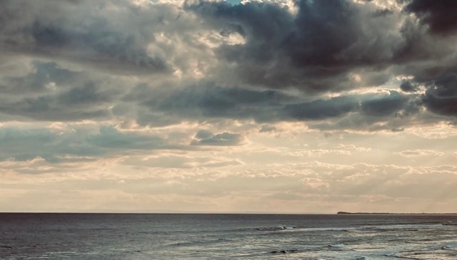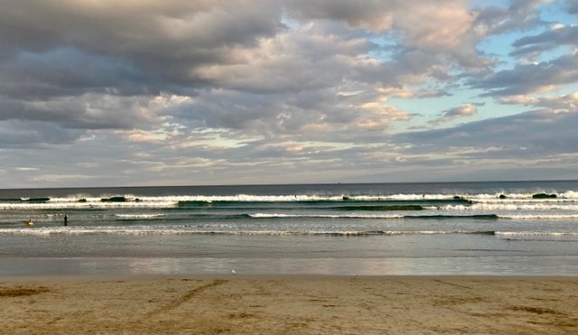 Ocean Grove: The surf beach, looking back toward Point Lonsdale … surf was up with lots of board riders.