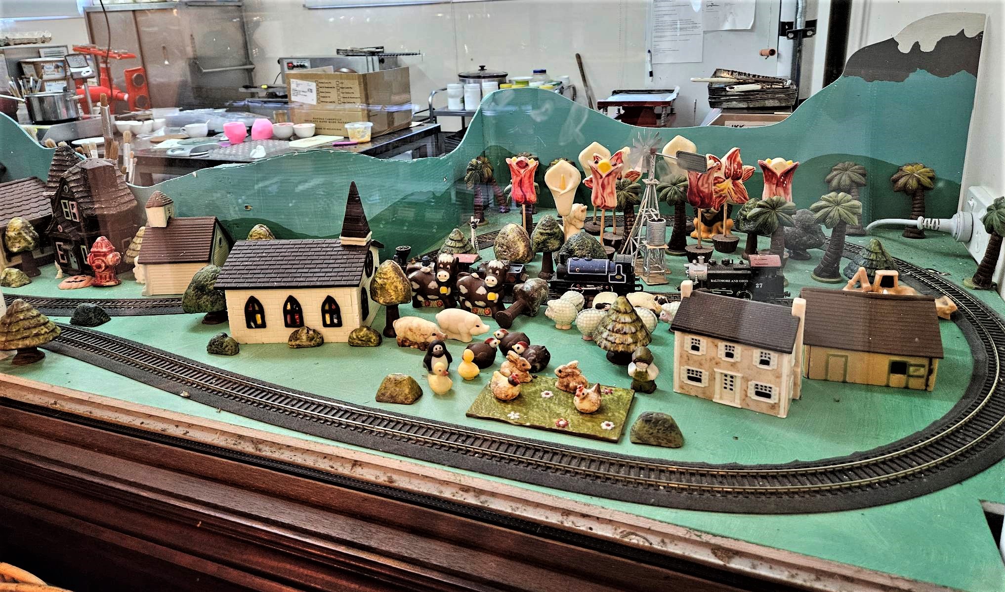 Me and my ‘cheesecake’ — The model train/railway in front of the kitchen area.