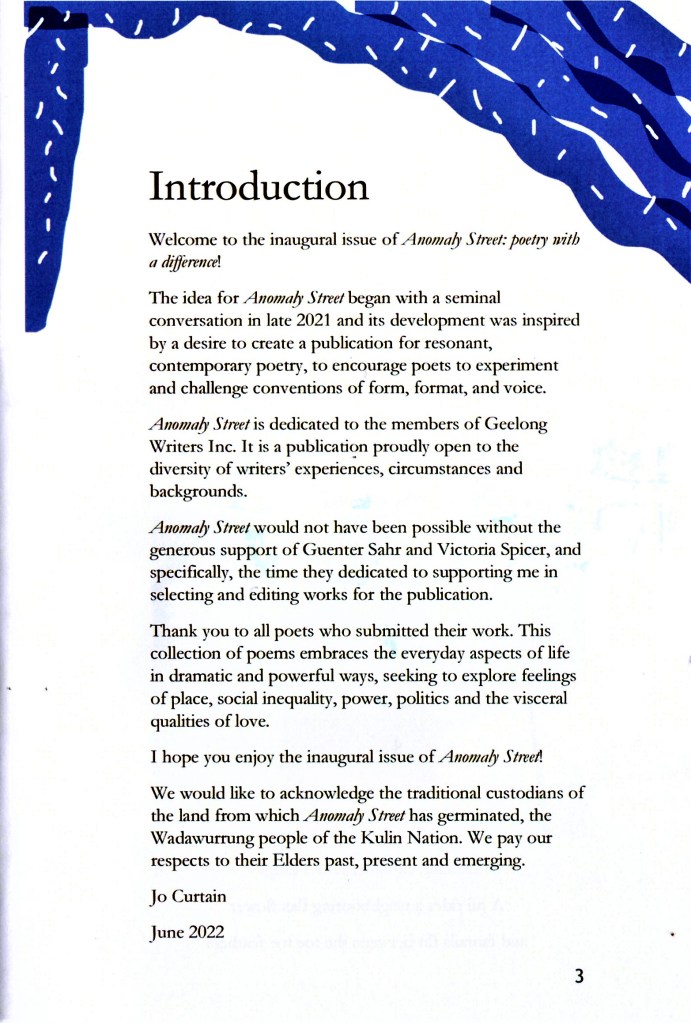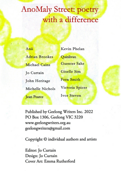 This evening I went to the book launch of The Geelong Writers, Anomaly Street (Poetry With A Difference), a twice-yearly collection of poetry that creates jolts for flatlined minds, and to the editor, Jo Curtain, for selecting my poem. Below is a photo of the poem’s presentation in the book … (my scanner is broken)