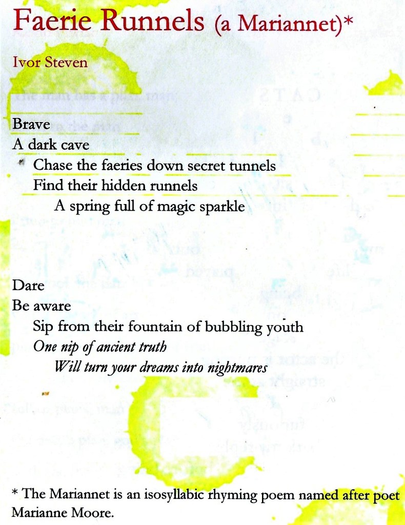 List night Geelong Writers Inc. launched the 2nd Issue of this year’s AnoMaly Street, Chapbook Publication (Poetry with a difference), and I am honoured to have my piece “Faerie Runnels” selected in this superbly produced journal. It’s always a great thrill for me to have my poems represented in a locally produced and published book. The Below Photo/Scan shows how my poem appears in the book.