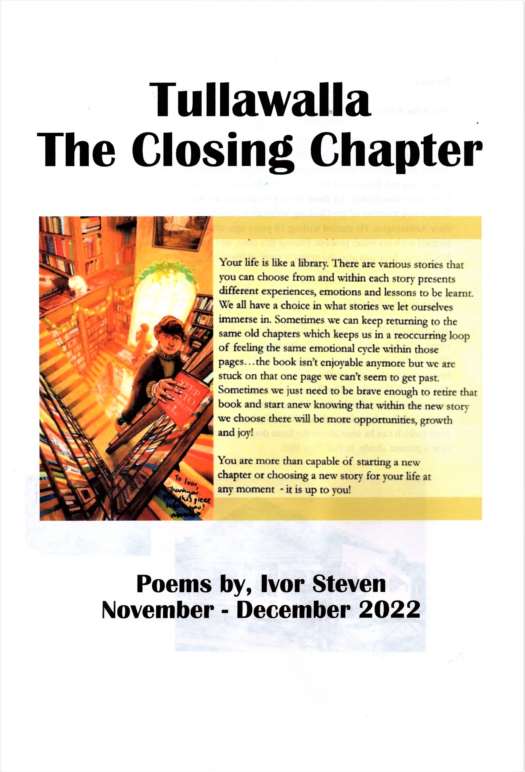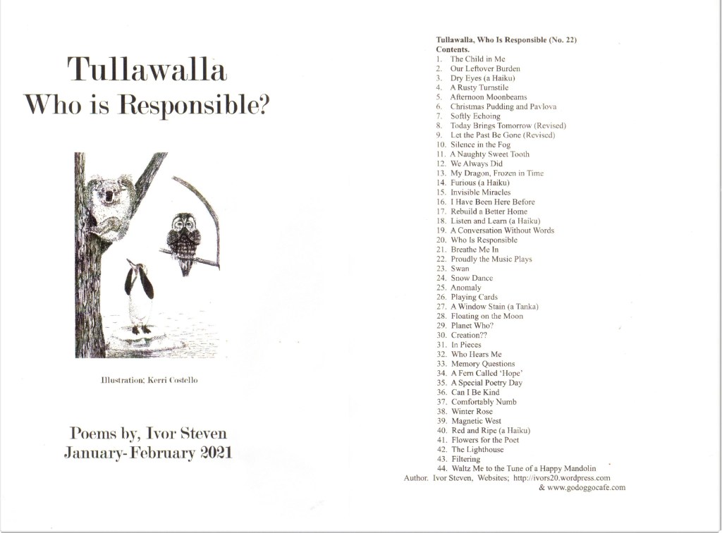 … As always, they are available for purchase, either as a hard copy ‘Booklet’, or a PDF format….. All proceeds go to the MS Charity Shop, here in Geelong West….. Please contact me here through my website page and I can chat to you about arrangements from there…. Oh, the booklet is appropriately called, “Tullawalla, The Closing Chapter”… And here is the link to my website >> https://ivors20.wordpress.com
