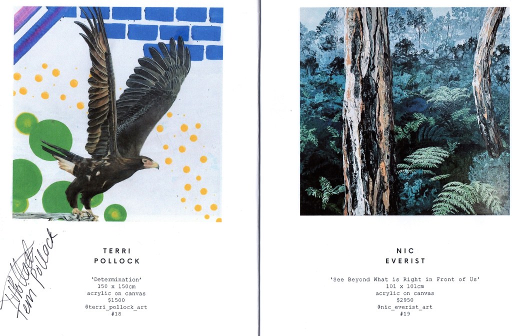 L – Terri Pollock: the challenging “Determination”, acrylic on canvas R – Nic Everist: The compelling “See Beyond What is Right in Front of Us”, acrylic on canvas.