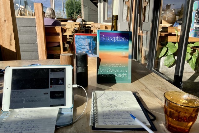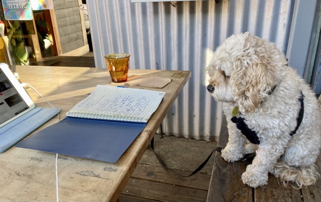 Sun is shining on our table … Frankie perusing my poem … Frankie gives me that look