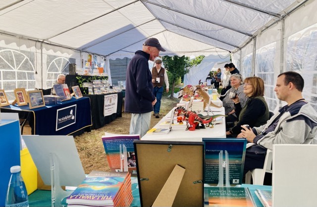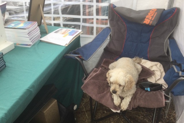 Sunday Morning.Another 9.00am start, but I decided to take Frankie to the Festival as my little helper.While walking from the car to the Marquee, a young lady kindly offered to carry Frankie’s fold-up camp chair. I thanked “Louise” for friendly assistance, and later on she came to my stall and purchased a copy of “Until Eyes Hear Sound”.