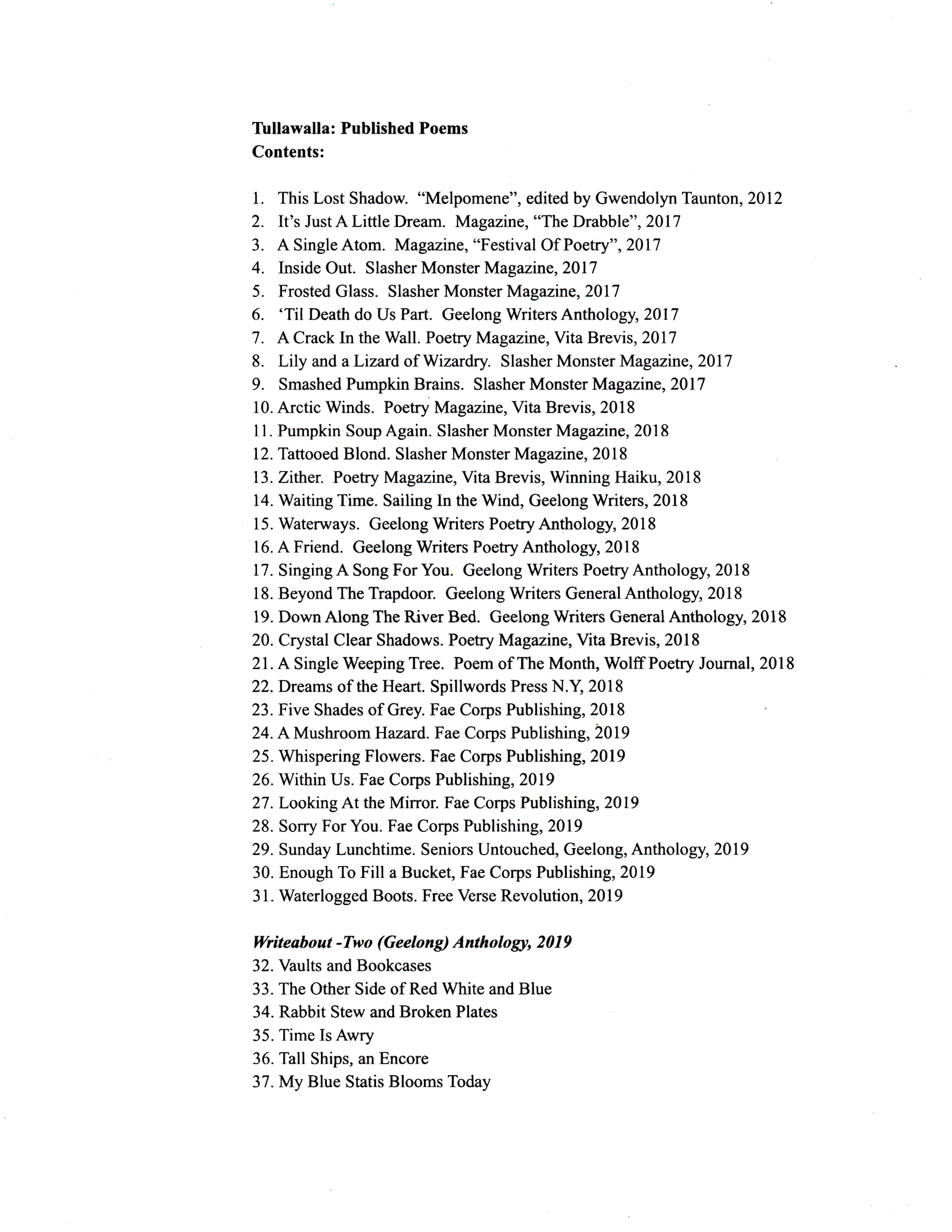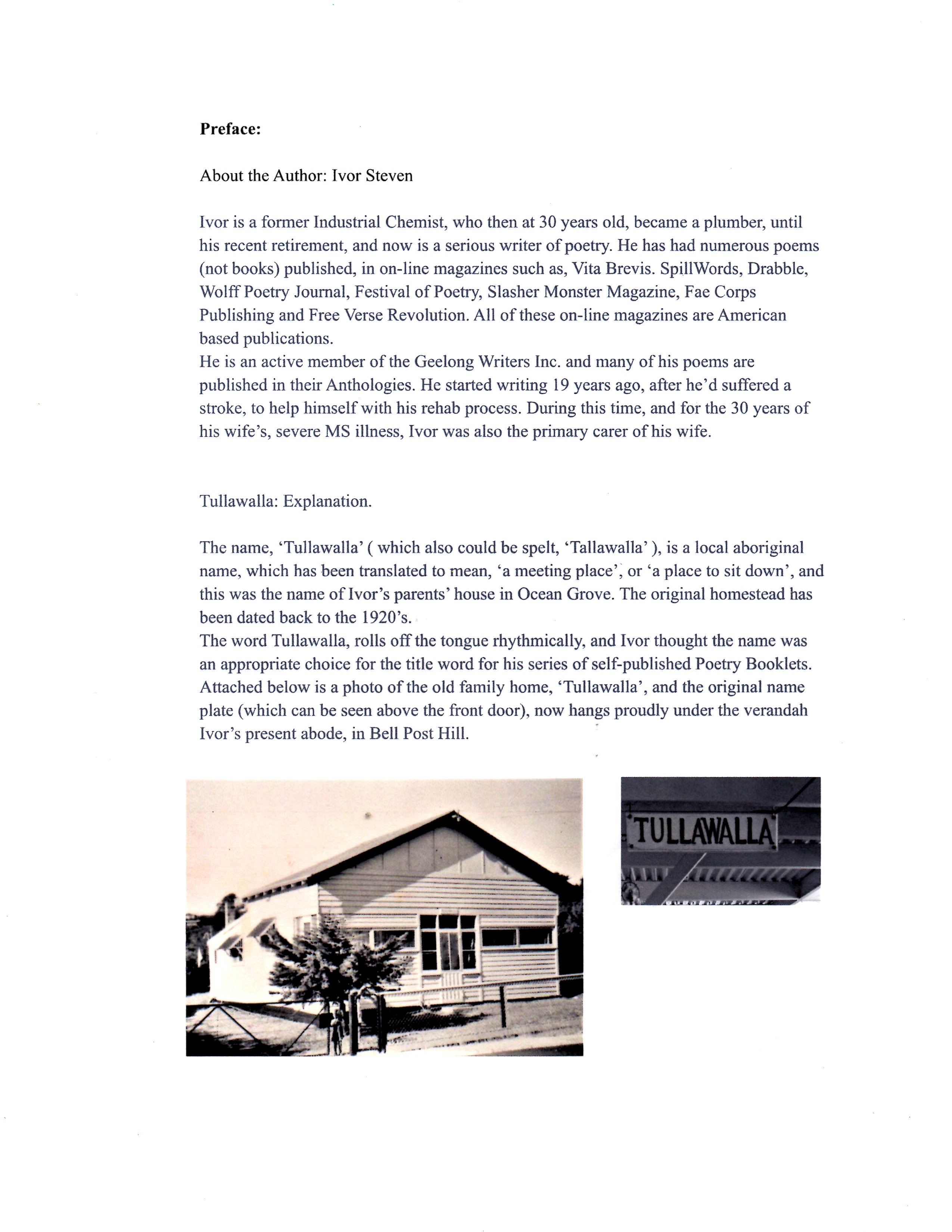 Ivor Steven was formerly an Industrial Chemist, then a Plumber, and has been writing poetry for 19 years. His book “Tullawalla” was recently published. He has had numerous poems published in anthologies, and on-line magazines. He is an active member of the Geelong Writers Inc.(Australia), and is a team member/barista with the on-line magazine “Go Dog Go Cafe” (America)