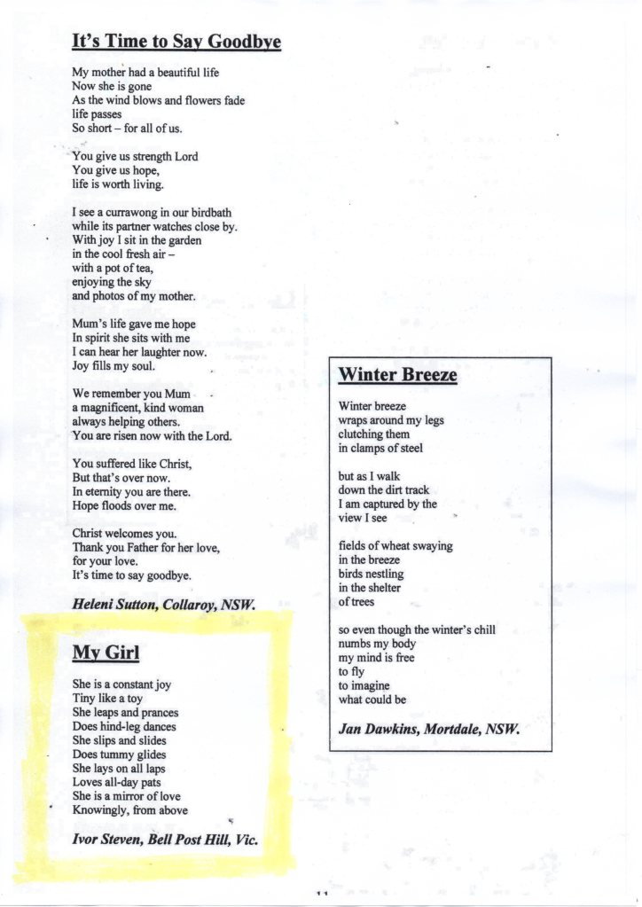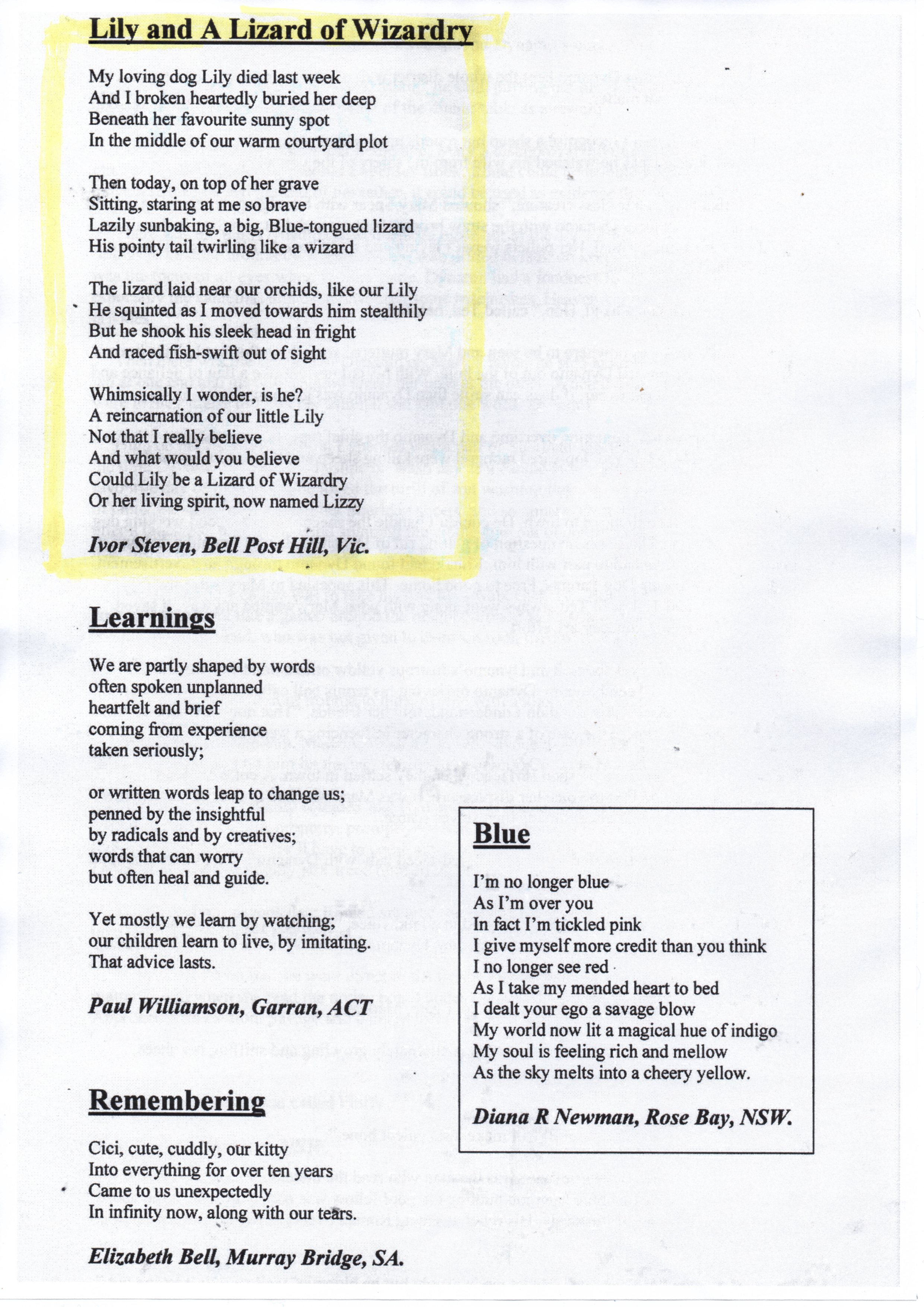 I am pleased and proud to announce that my two ‘Doggie’ poems Lily and the Lizard of Wizardry & My Girl, were published in the Positive Words Magazine, October Issue. and thank you to the Editor, Sandra, for selecting my poems… For further information about this fabulous Australian magazine, visit their site via this link > https://positivewordsmagazine.wordpress.com/ Attached below, I have scanned the poems directly from my copy of the Magazine