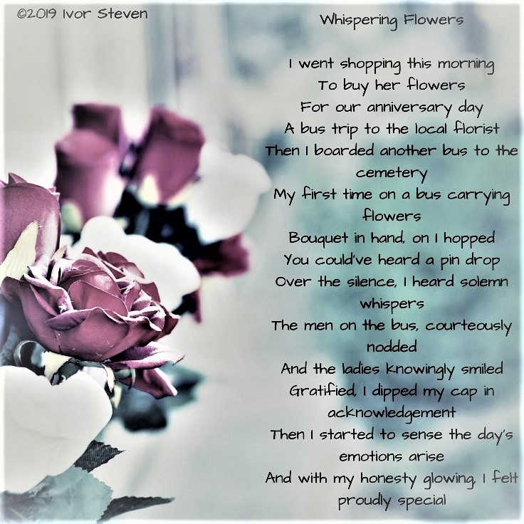 I went shopping this morning To buy her flowers For our anniversary day A bus trip to the local florist Then I boarded another bus to the cemetery My first time on a bus carrying flowers Bouquet in hand, on I hopped You could’ve heard a pin drop Over the silence, I heard solemn whispers The men on the bus, courteously nodded And the ladies knowingly smiled Gratified, I dipped my cap in acknowledgement Then I started to sense the day’s emotions arise And with my honesty glowing, I felt proudly special